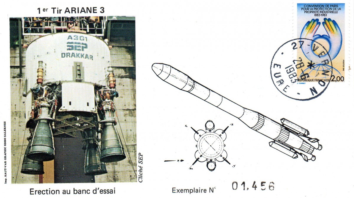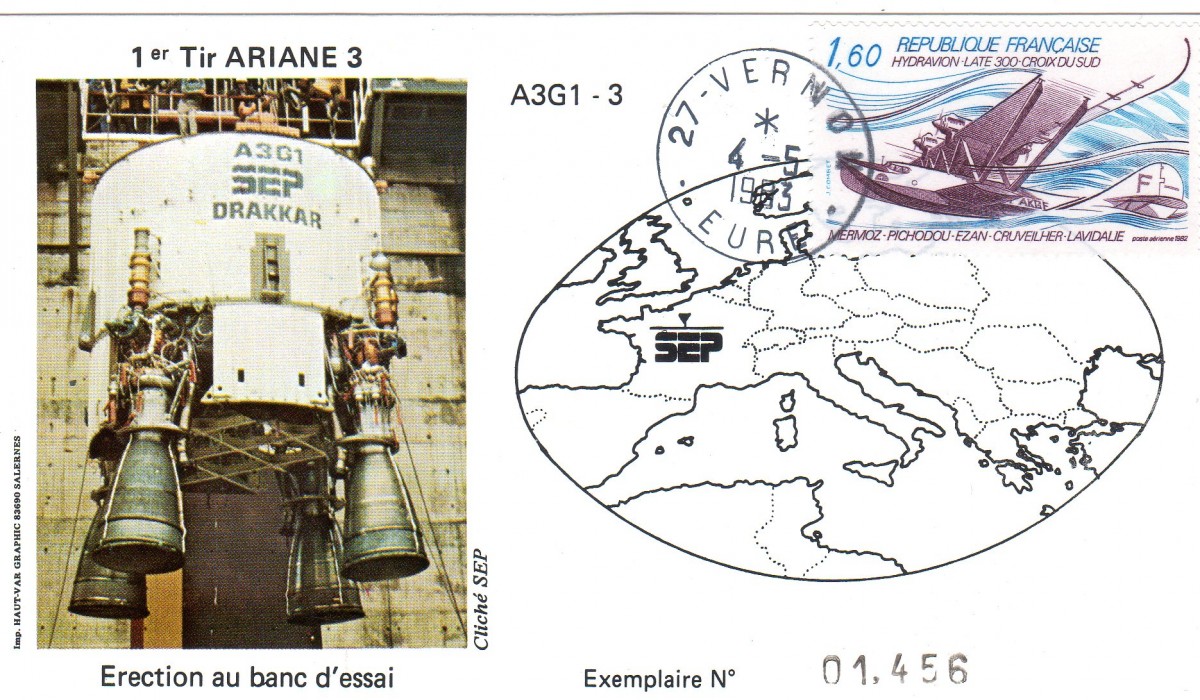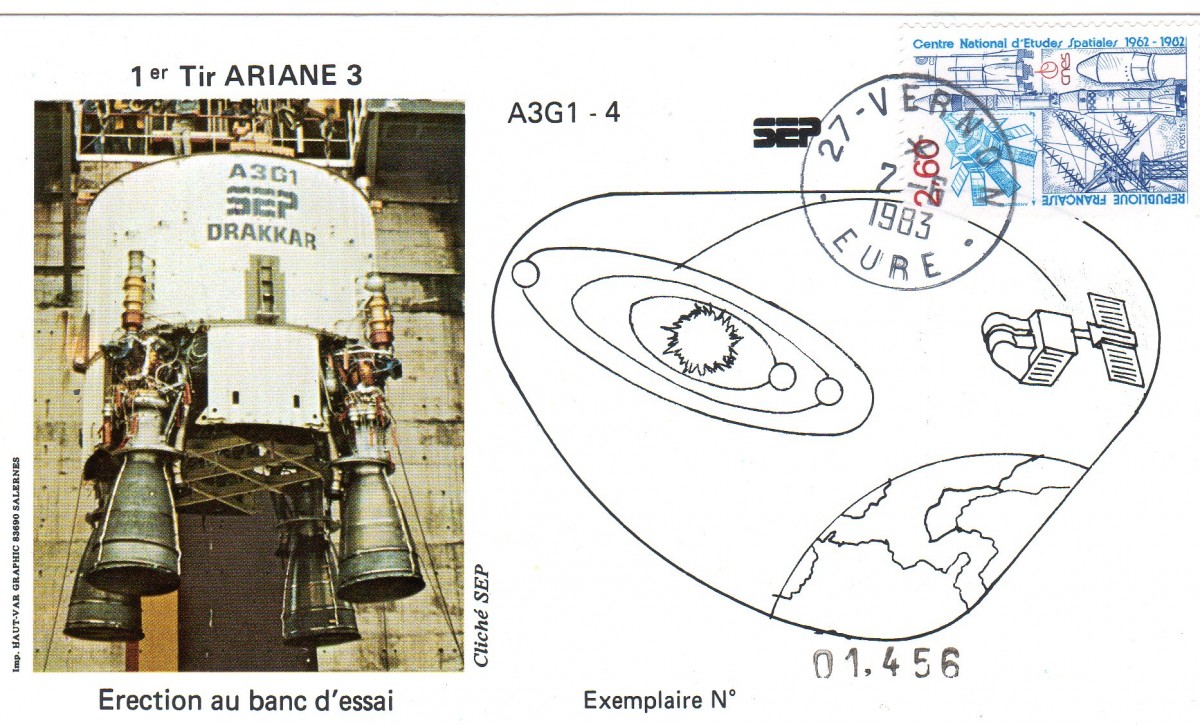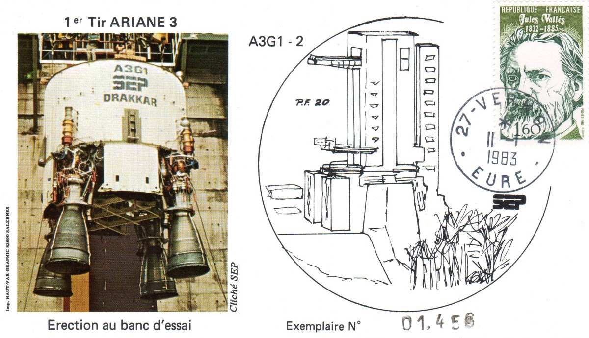 Premier essai d’amélioration des performances du premier étage « DRAKKAR » du lanceur Ariane 3 au banc d’essai PF 20 à Vernon. Campagne A3G1 : Elle comporte 5 tirs d’une durée totale de 432,20 secondes – les 3 derniers tirs ont été effectués avec les mêmes moteurs qui ont ainsi accumulé leur durée maximum de tir de 244 secondes. Les objectifs généraux Ariane 3 et les objectifs de démarrage Ariane 4 ont été atteints.