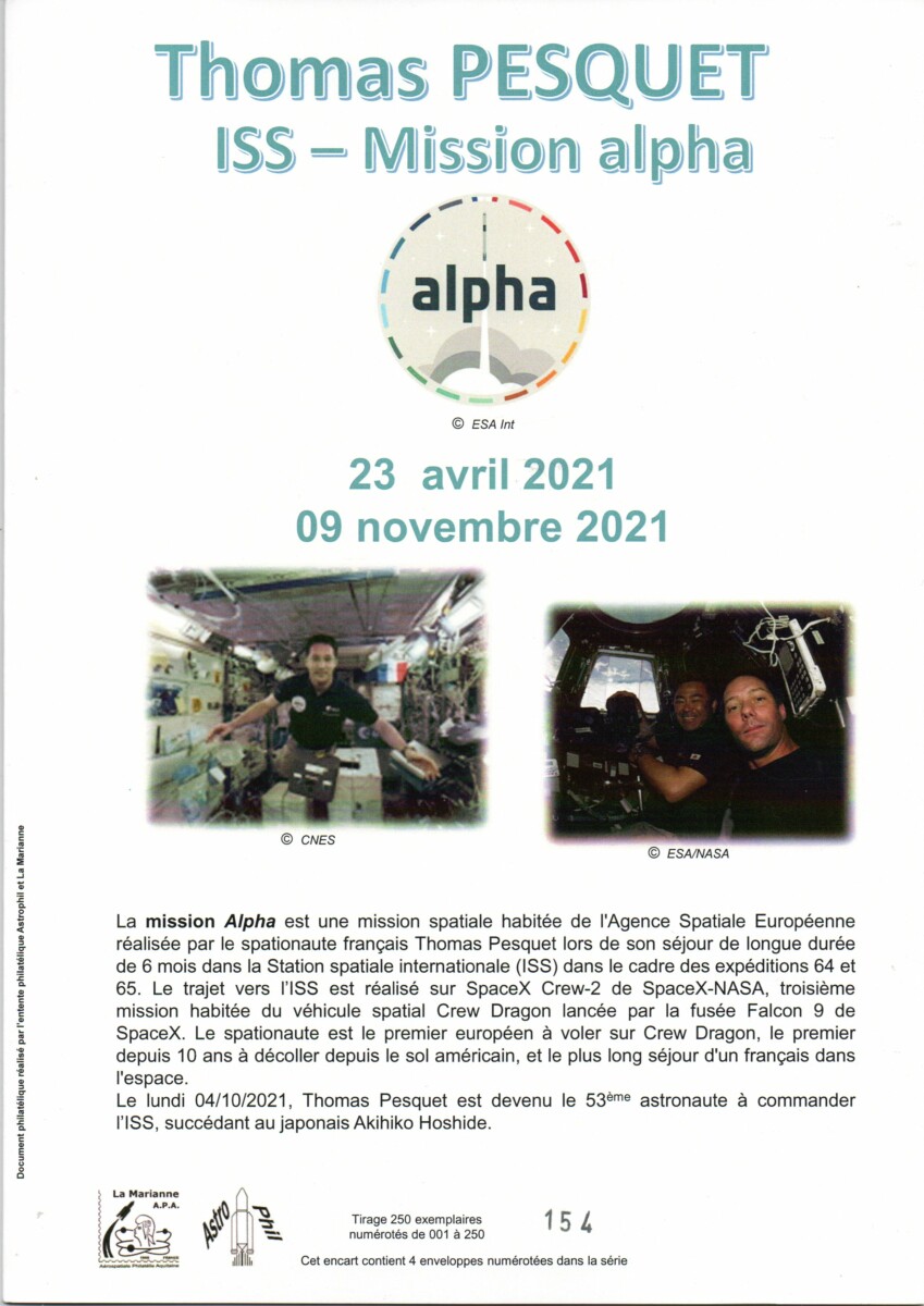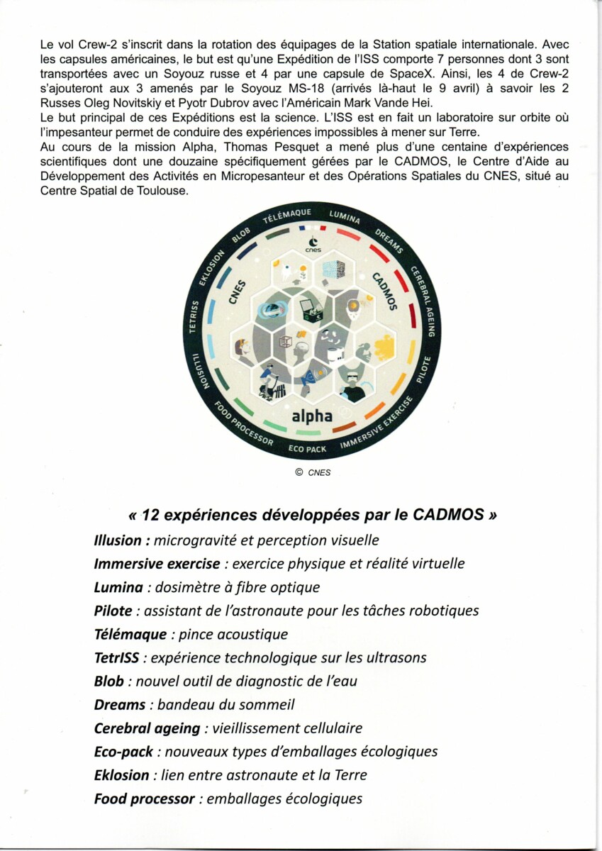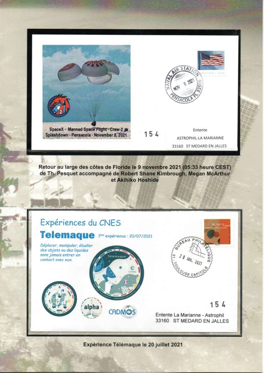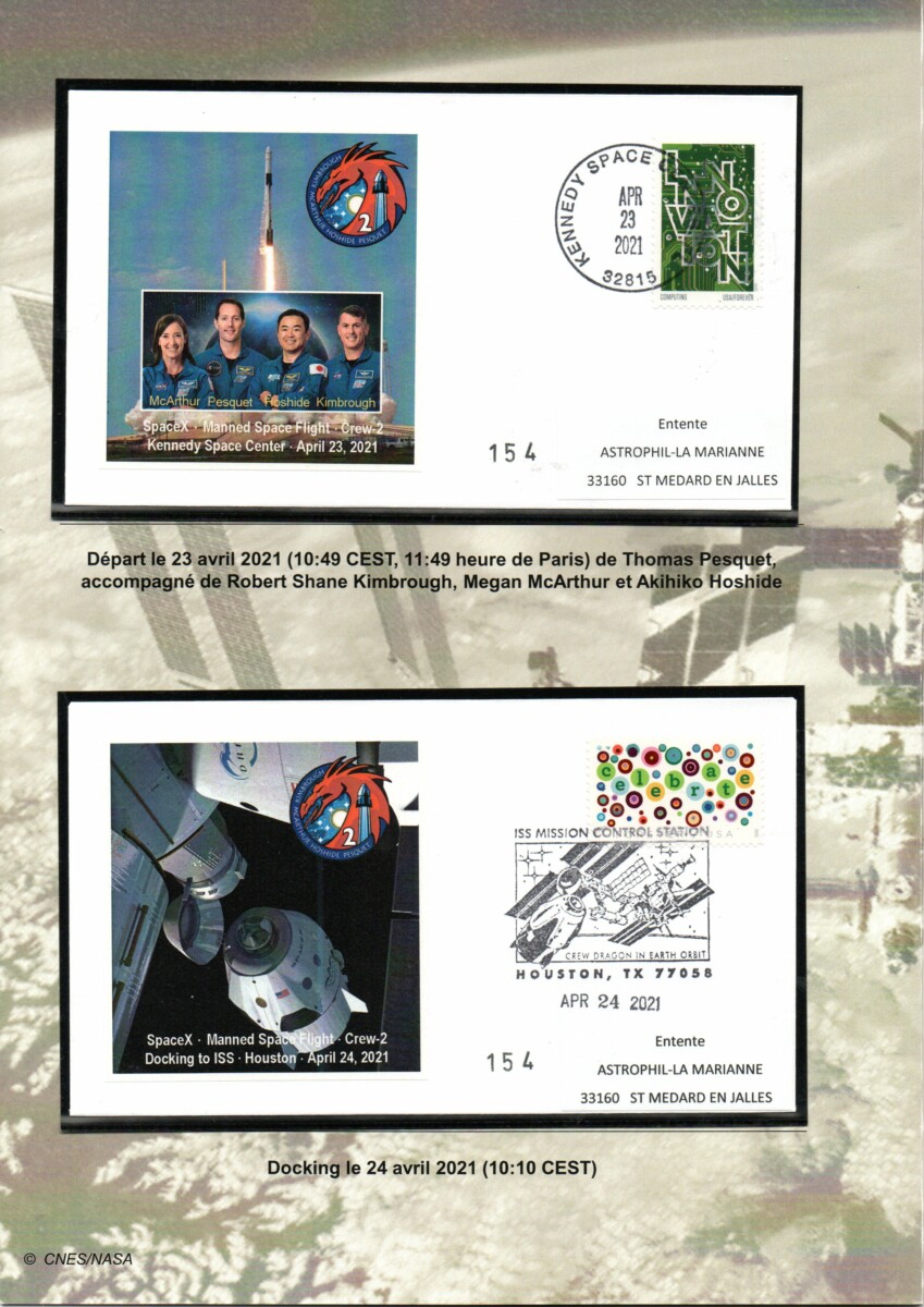 ISS – Mission ALPHA – « Thomas PESQUET » – Encart 4 enveloppes – Lancement SpaceX CREW-2 23 Avril 2021 – Docking ISS 24 Avril 2021 – Retour capsule CREW-2 08 Novembre 2021 – Expérience CNES ALPHA : Télémaque 20 Juillet 2021