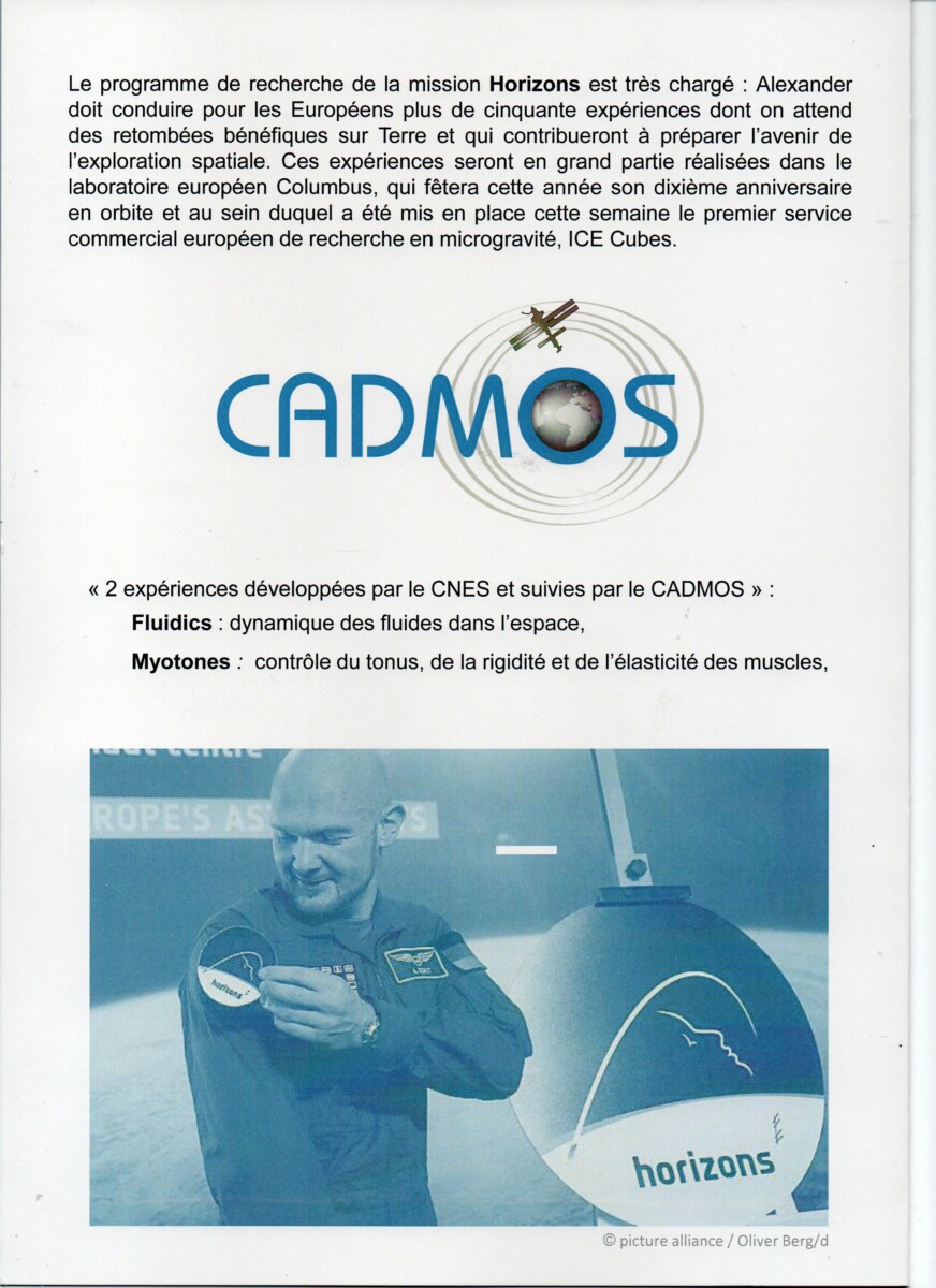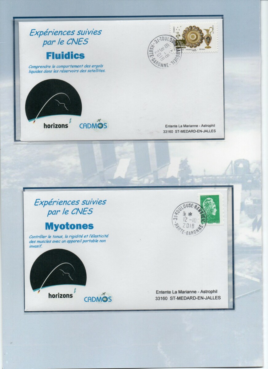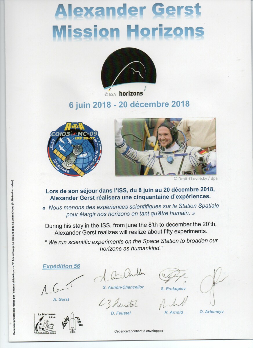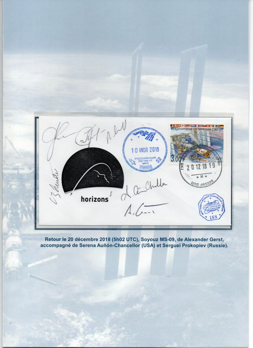 ISS Mission HORIZONS » Alexander Gerst » – Encart contenant 3 enveloppes – (Expériences CNES CADMOS « Fluidics 31/08/2018 », « Myotones 12/10/2018 » – Soyouz MS09 Enveloppe station ISS 10/06/2018 retour sur terre 20/12/2018).