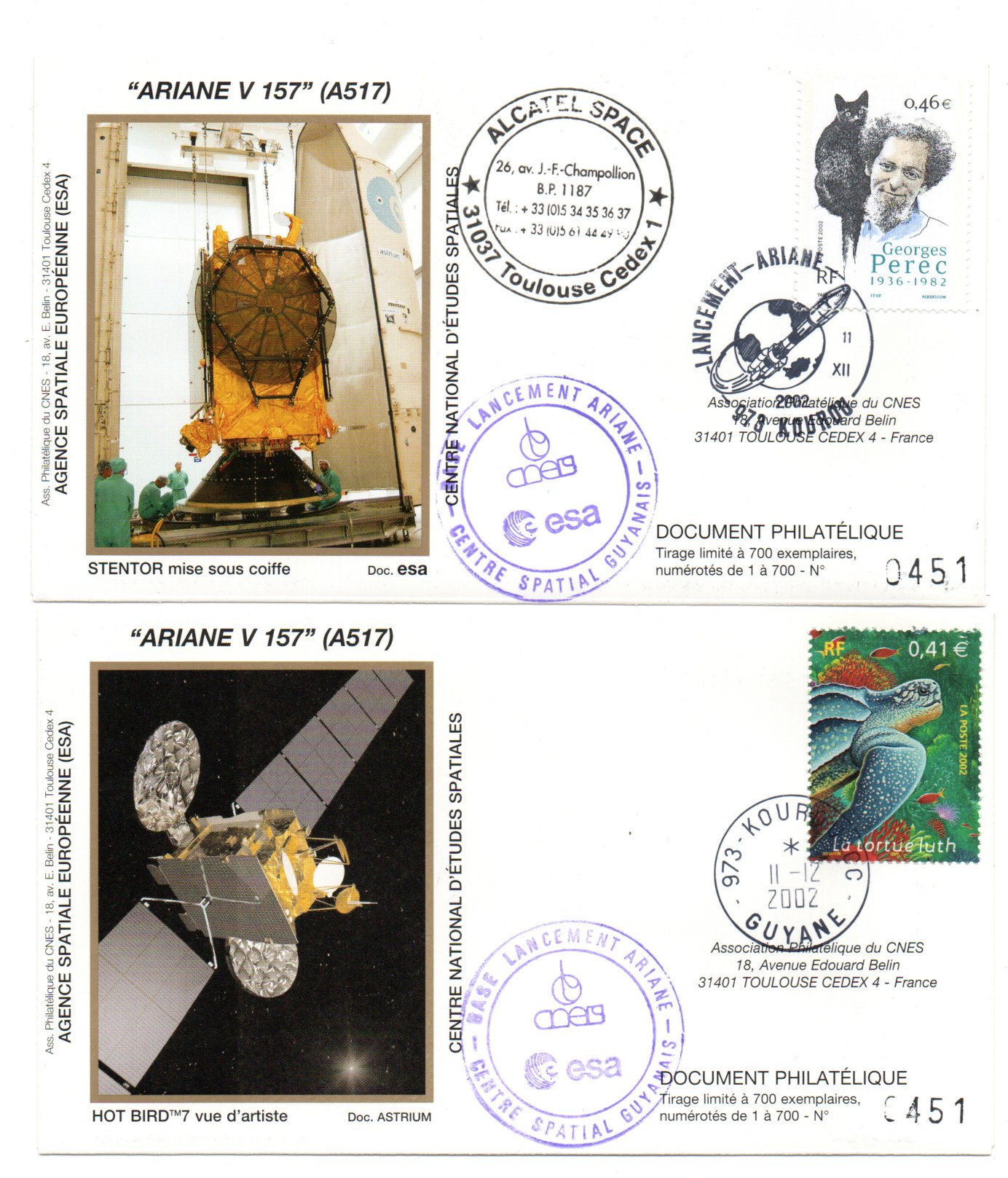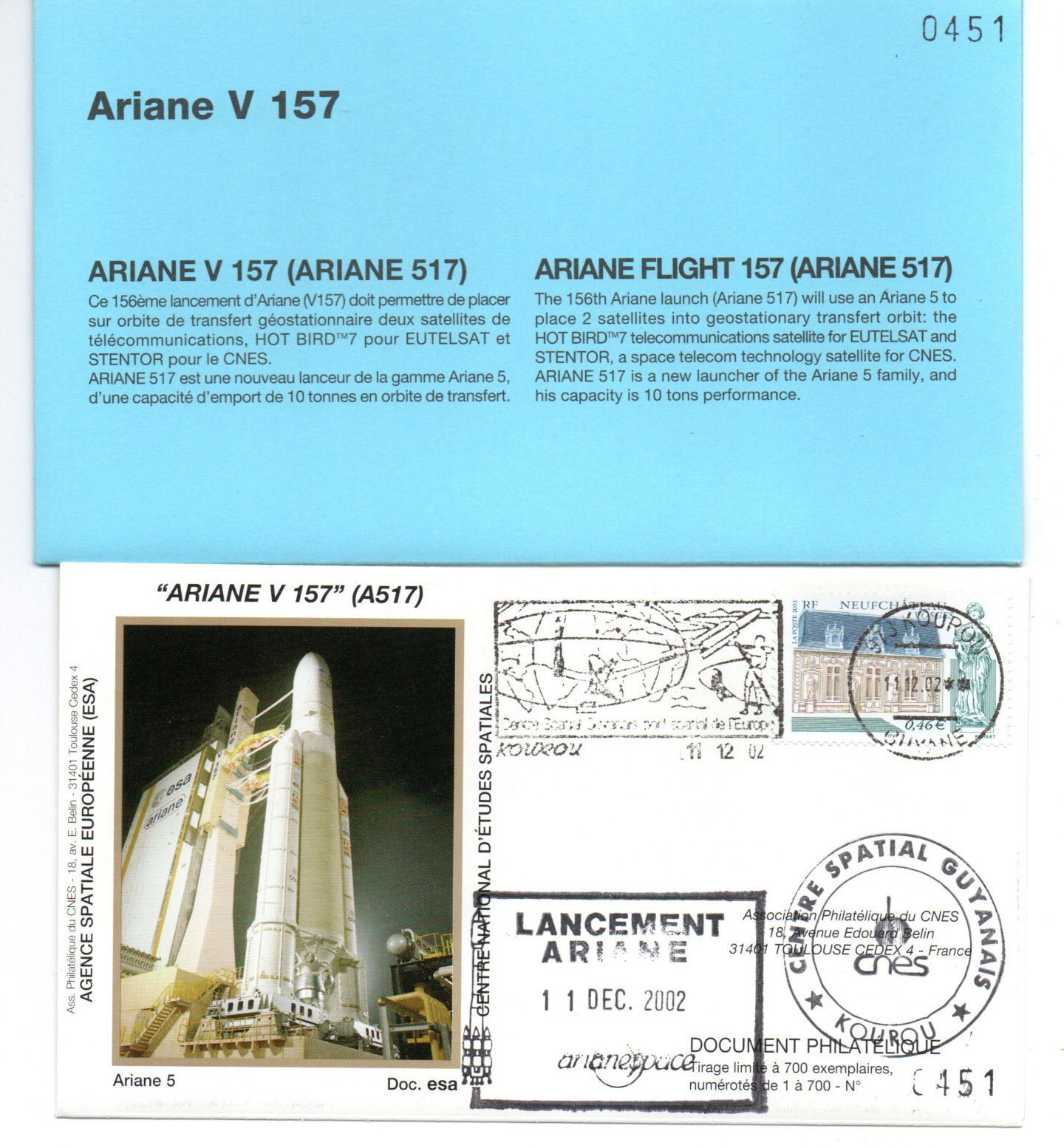 Accueil / ** TOUTES ** / CIRCULATIONS / - Circulations base Kourou - Ariane / Lancement ARIANE 517 – vol 157 – Kourou 11/12/2002 – Pochette CNES 3 enveloppes – C 42 Lancement ARIANE 517 – vol 157 – Kourou 11/12/2002 – Pochette CNES 3 enveloppes – C 421,00€ ref 9010353 1 en stock quantité de Lancement ARIANE 517 – vol 157 – Kourou 11/12/2002 – Pochette CNES 3 enveloppes – C 42 Ajouter au panier Catégories : - Circulations base Kourou - Ariane, ** TOUTES **, CIRCULATIONS Description Description Produits similaires Vol L02 du 23 mai 1980 45,00€ Lire la suite Vol 12 du 08 Février 1985 10,00€ Lire la suite Vol L04 du 19 Décembre 1981 30,00€ Lire la suite Vol 34 du 27 Octobre 1989 2,50€ Lire la suite