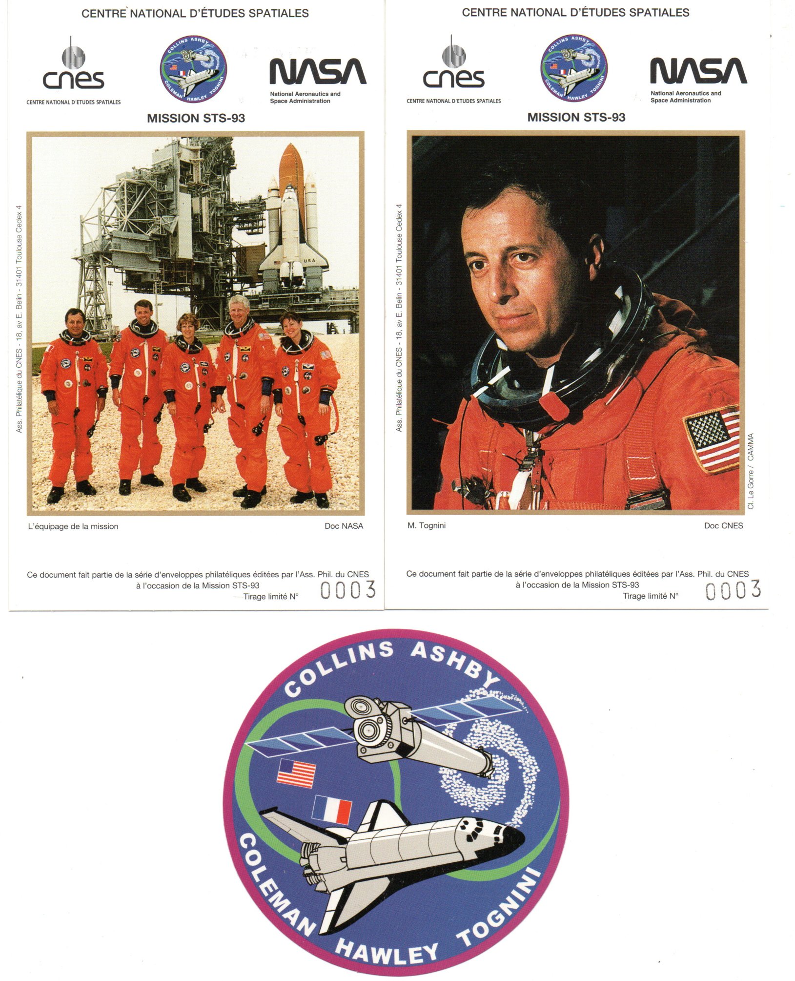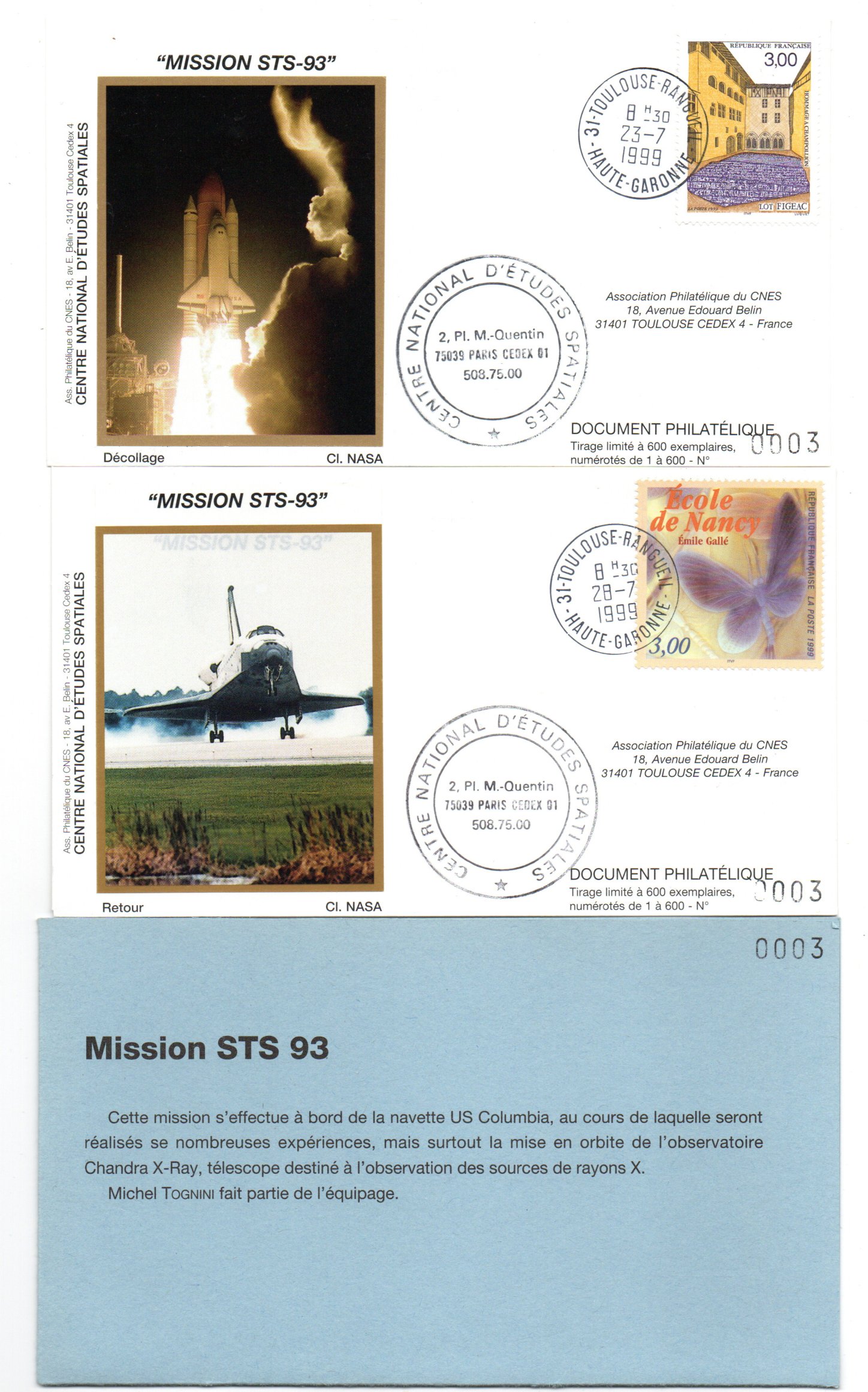 Lancement Navette Columbia Mission STS-93 CNES, NASA Télescope Chandra – KSC 23 Juillet 1999 – Pochette CNES 2 Enveloppes, 2 CP, Badge Mission – C 47 – Réf 9030032