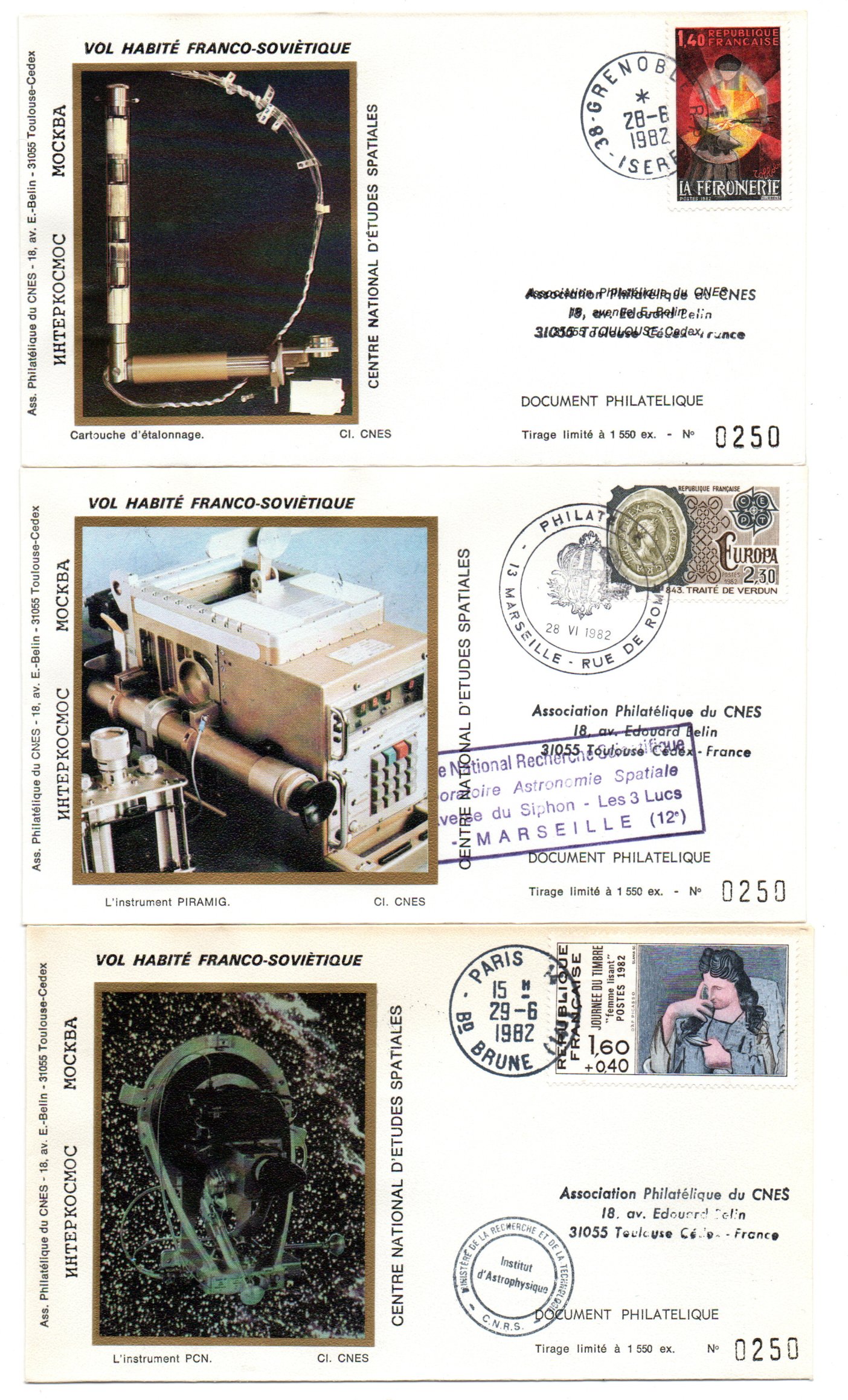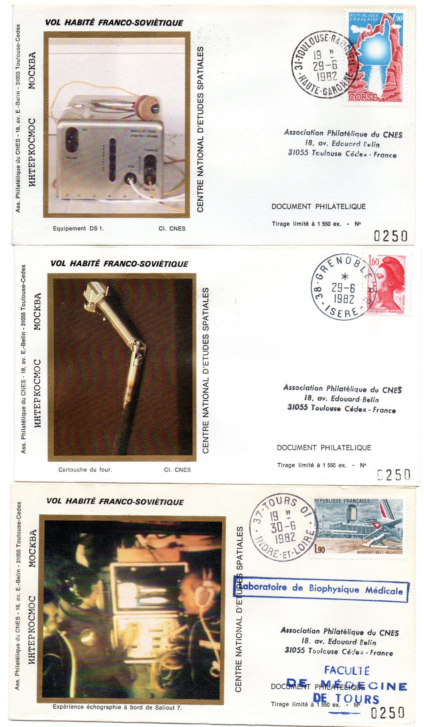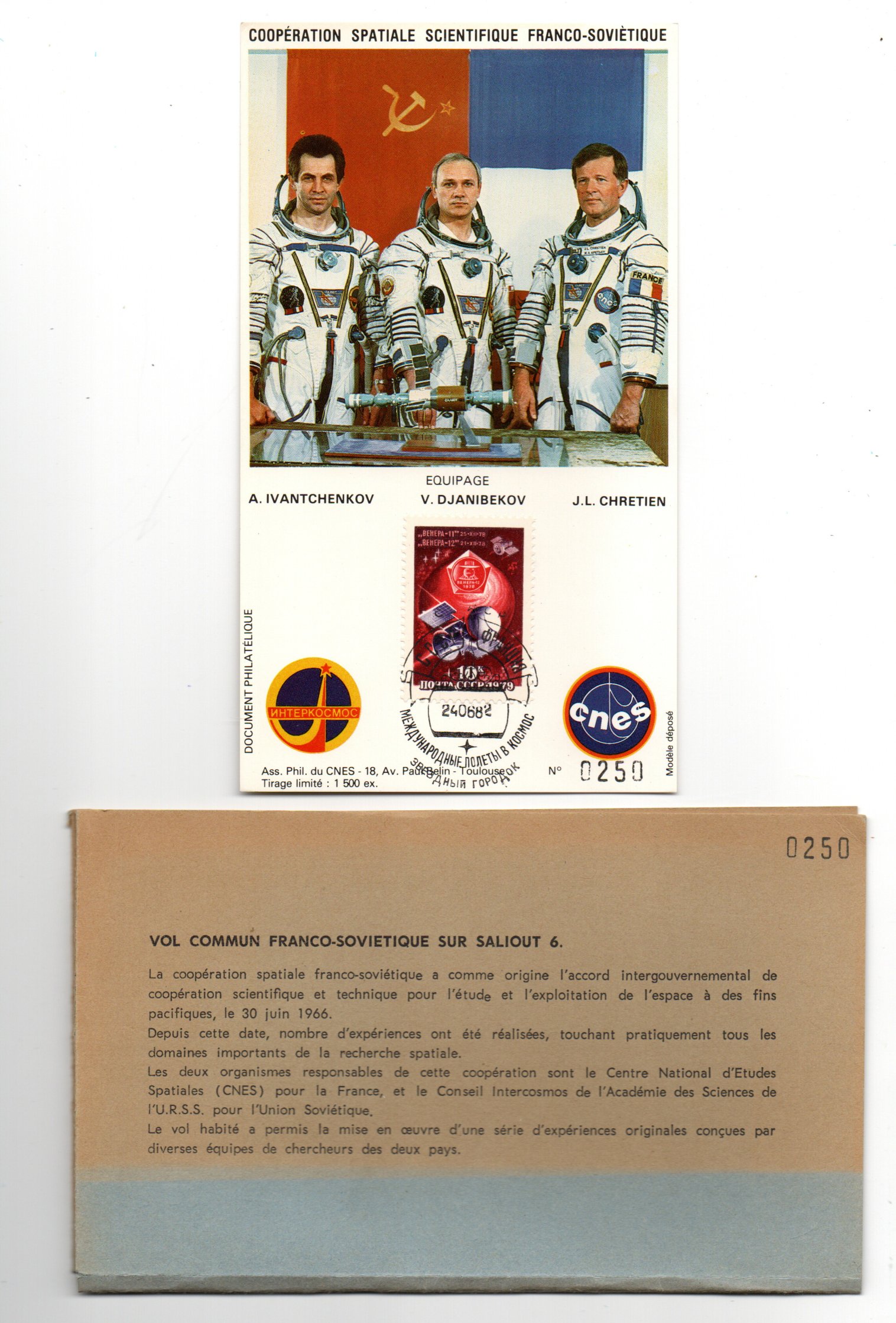 Lancement Soyouz T6 – Baïkonour 24 Juin 1982- Mission scientifique franco-soviétique Saliout 7 – Pochette complète CNES 16 Enveloppes, 1 encart, 3 CP – C 47 – Réf 9040011