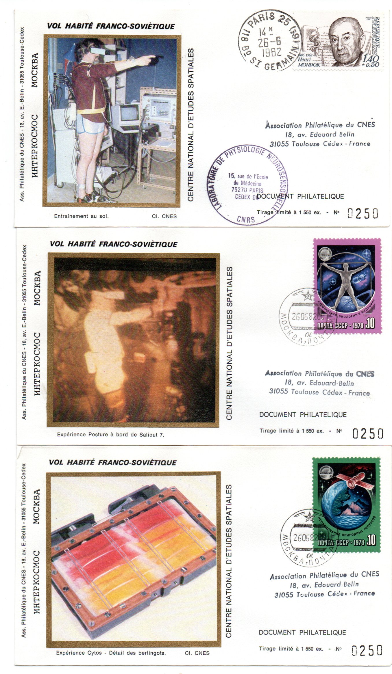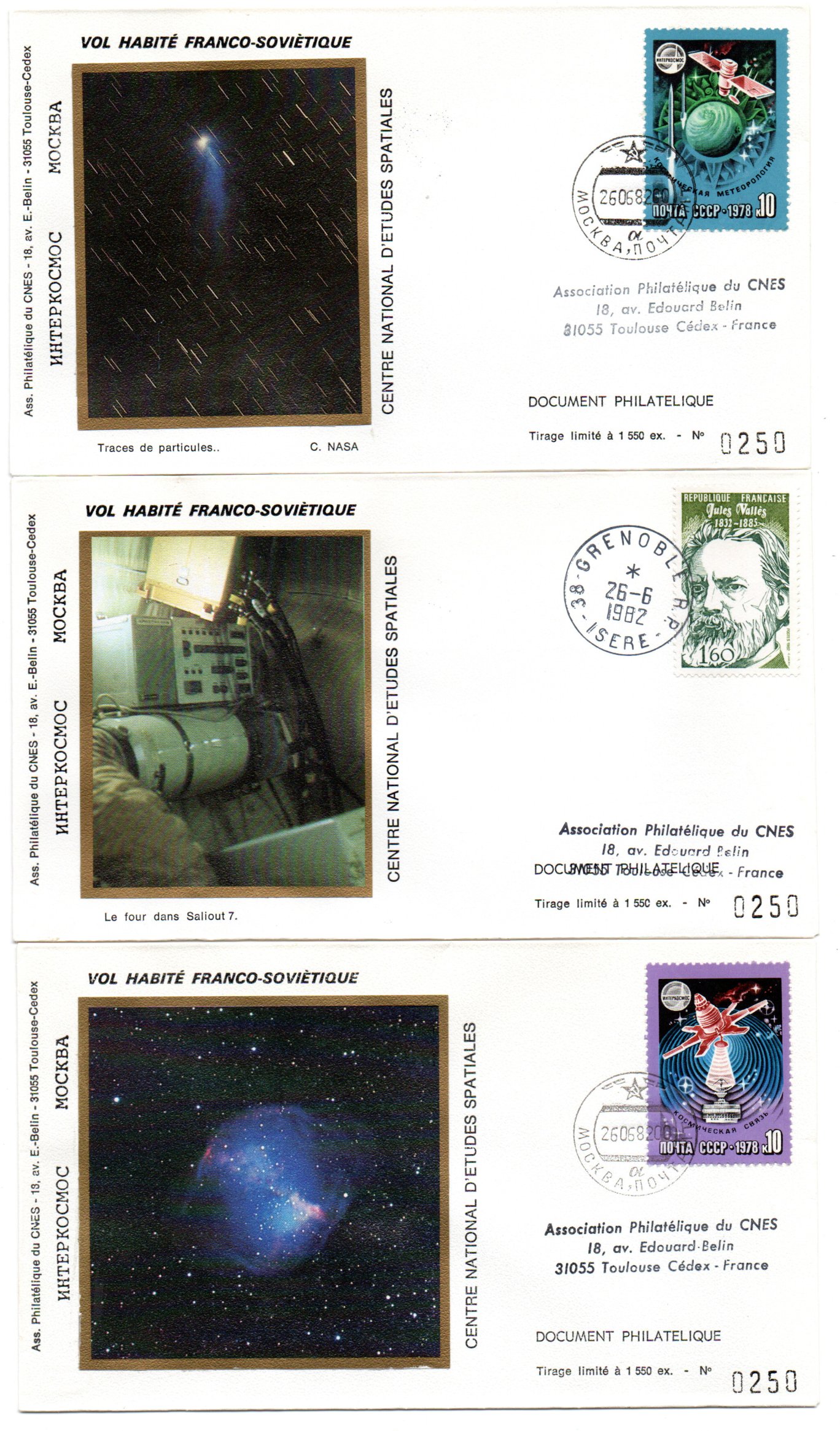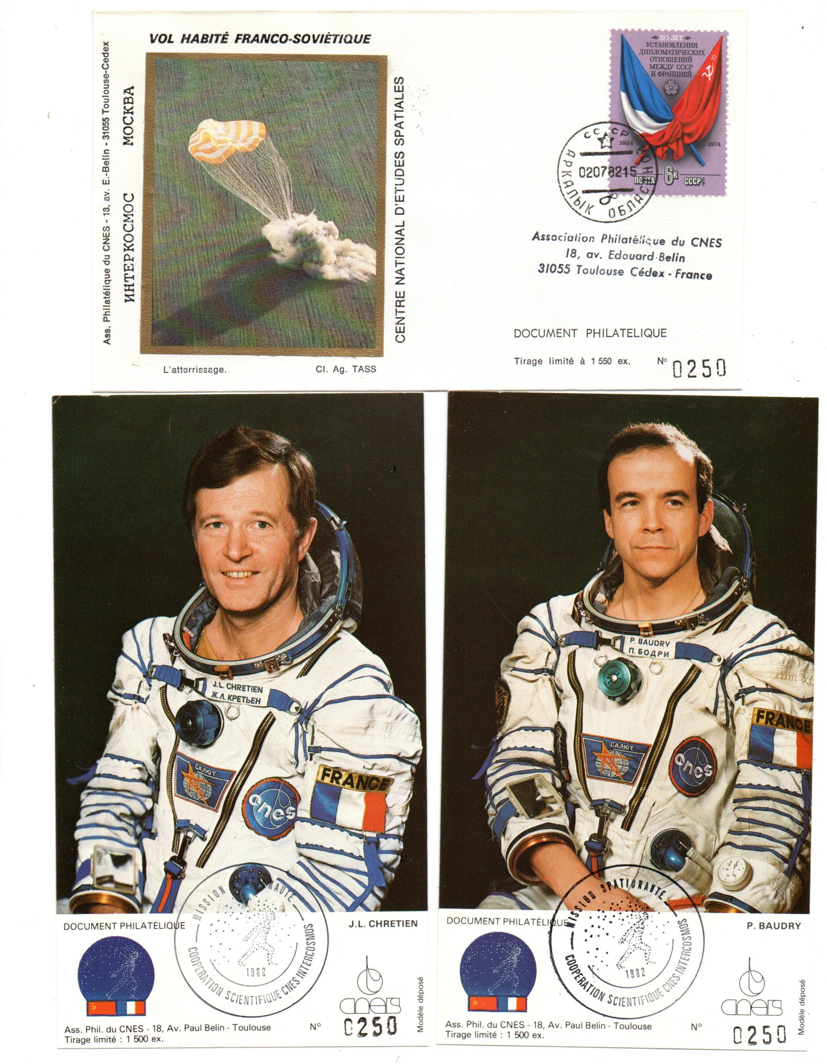 Lancement Soyouz T6 – Baïkonour 24 Juin 1982- Mission scientifique franco-soviétique Saliout 7 – Pochette complète CNES 16 Enveloppes, 1 encart, 3 CP – C 47 – Réf 9040011