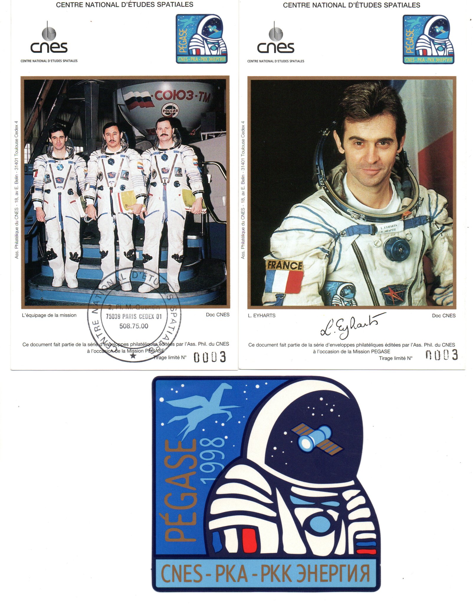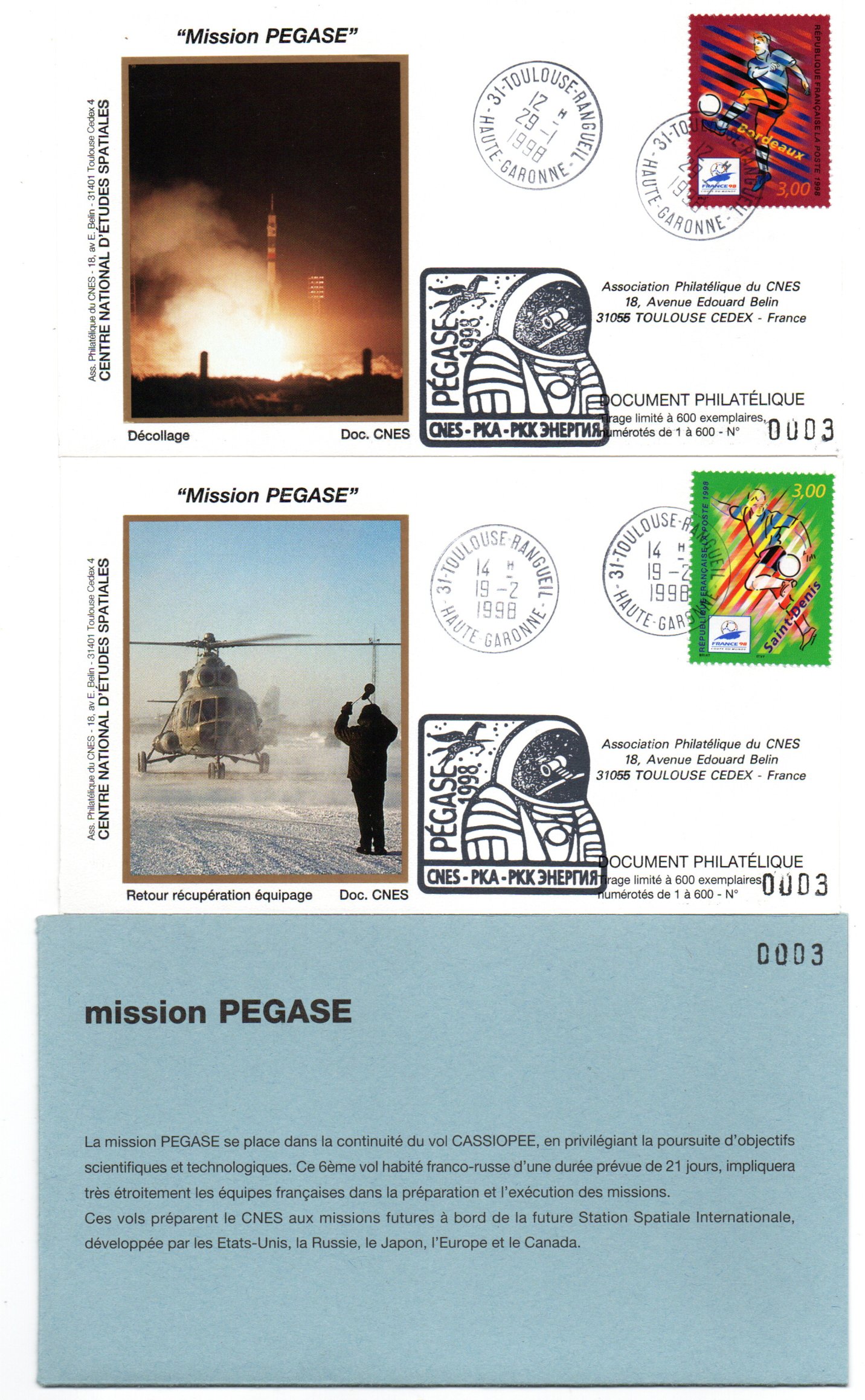 Lancement Soyouz TM27 – Baïkonour 28 Janvier 1998 – Mission scientifique franco-soviétique Pegase Station MIR – Pochette CNES 2 Enveloppes, 2 Cartes, Badge Mission – C 47 – Réf 9040018