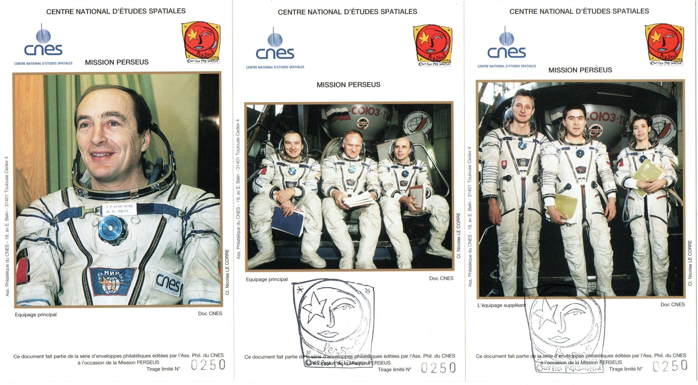 Lancement Soyouz TM29 – Baïkonour 20 Février 1999 – Mission scientifique franco-soviétique Perseus Station MIR – Pochette CNES 3 Enveloppes, 5 Cartes, Badge Mission – C 47 – Réf 9040019