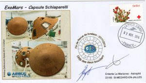 Aurélien Pisseloup, Responsable des avant-projets et services en orbite et Yann Mignot, Responsable du service Matériaux de protection et process avancés, travaillent sur le site Airbus Defence and Space en Aquitaine. En Novembre 2014 Airbus Defence and Space a livré à Thales Alenia Space, maître d’œuvre du programme pour le compte de l’Agence Spatiale Européenne (ESA) les boucliers thermiques destinés à protéger la capsule Schiaparelli lors de sa rentrée dans l’atmosphère martienne.