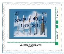 Timbre à Moi émis par les associations Astrophil et La Marianne à l’occasion de l’exposition de saint médard en Jalles le 14 Décembre 2019, Exposition ayant pour sujet le 40ème anniversaire du premier lancement d’Ariane.