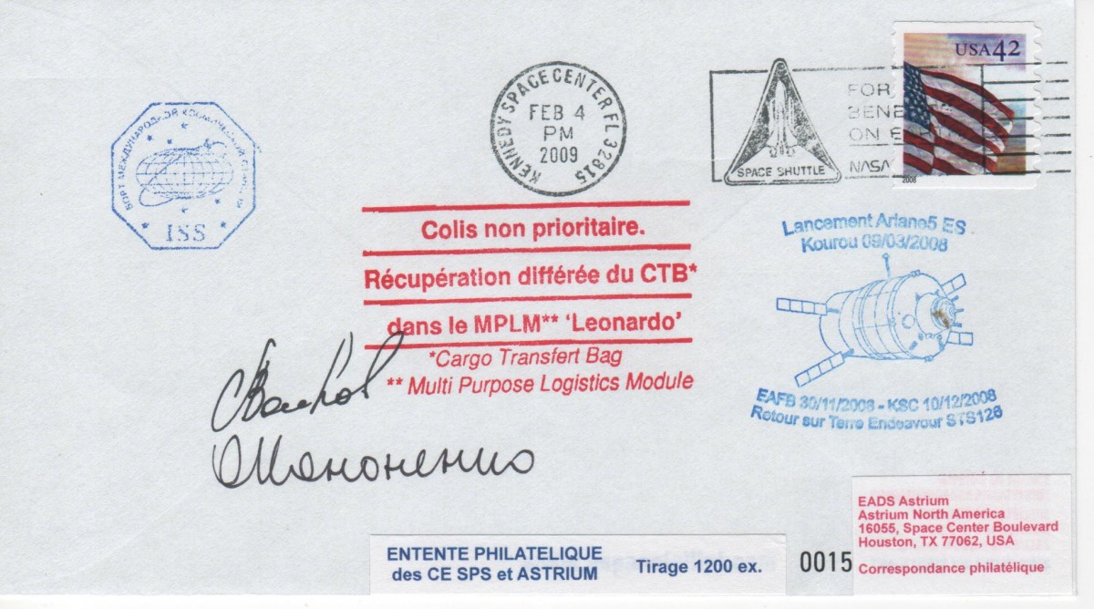 Vol 181 – Début Décembre 2007 – Placé dans un sac de transport spécial, cette enveloppe a parcouru plus de 177 000 000 Km dans l’espace. Début Décembre 2007, elle est embarquée dans l’ATV qui rejoint l’ISS le 03 Avril 2008. Elle revient sur terre le 30 Novembre 2008 à bord de la navette Américaine Endeavour (Mission STS 126, ULF-2) sur la Base d’Edwards Air Force en Californie. Elle retrouve finalement l’air libre le 04 Février 2009, au retrait du CTB du MPLM « Léonardo », pour être oblitérée sur son lieu d’arrivée final.