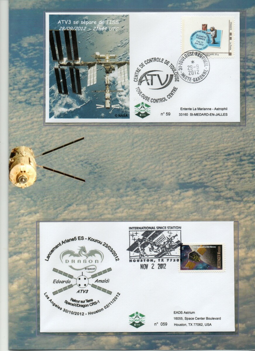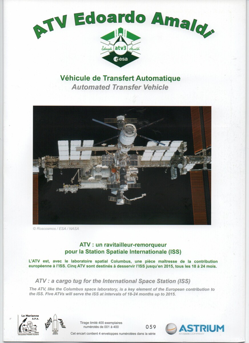 Vol 205 – Encart ATV 3  » Edoardo Amaldi » – Contenant 4 enveloppes – (Station poursuite Redu 23/03/2012, Docking ISS 28/03/2012, Séparation ISS 28/09/2012, Enveloppe embarquée sur ATV 3 retour par capsule Dragon CRS-1 02/11/2012.)